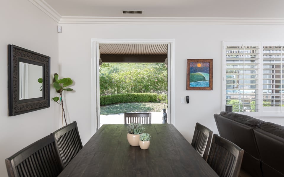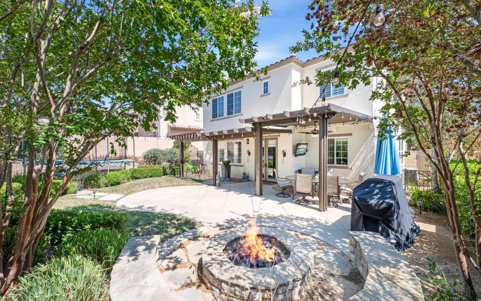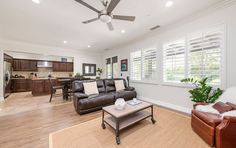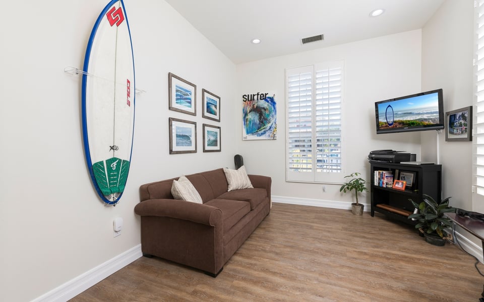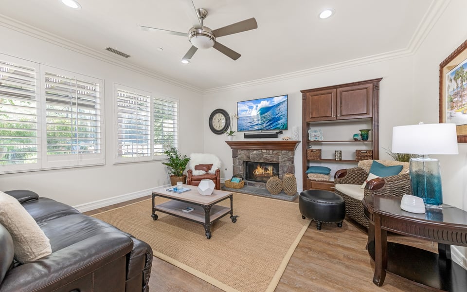 Side entry front door leads into a bright sitting room, currently being used as an office space, and nice large formal dining room. Plantation shutters and neutral colors add the the beach feel. Dining room transitions nicely into the large kitchen with island, stainless steel appliances, Bosch dishwasher, 6 burner gas stove, plenty of cabinet and storage space, and rich granite countertops. You can't ask for anything more! Kitchen is open to large family room featuring cozy fireplace and new built in shelving. French doors lead to a private backyard with stone fire pit and seating, patio cover and nothing behind but green space. Perfect for those BBQ's on a warm night!